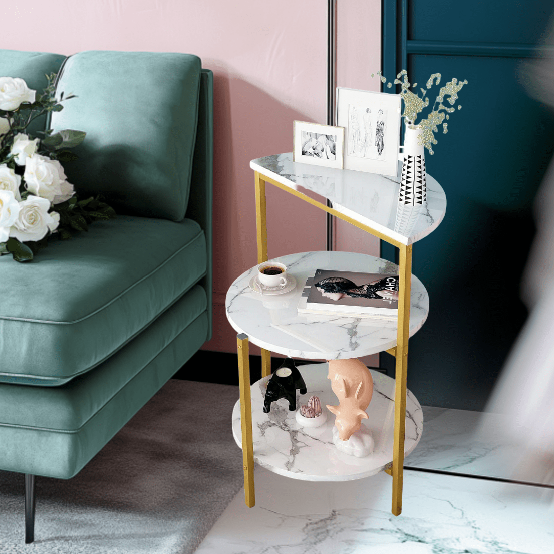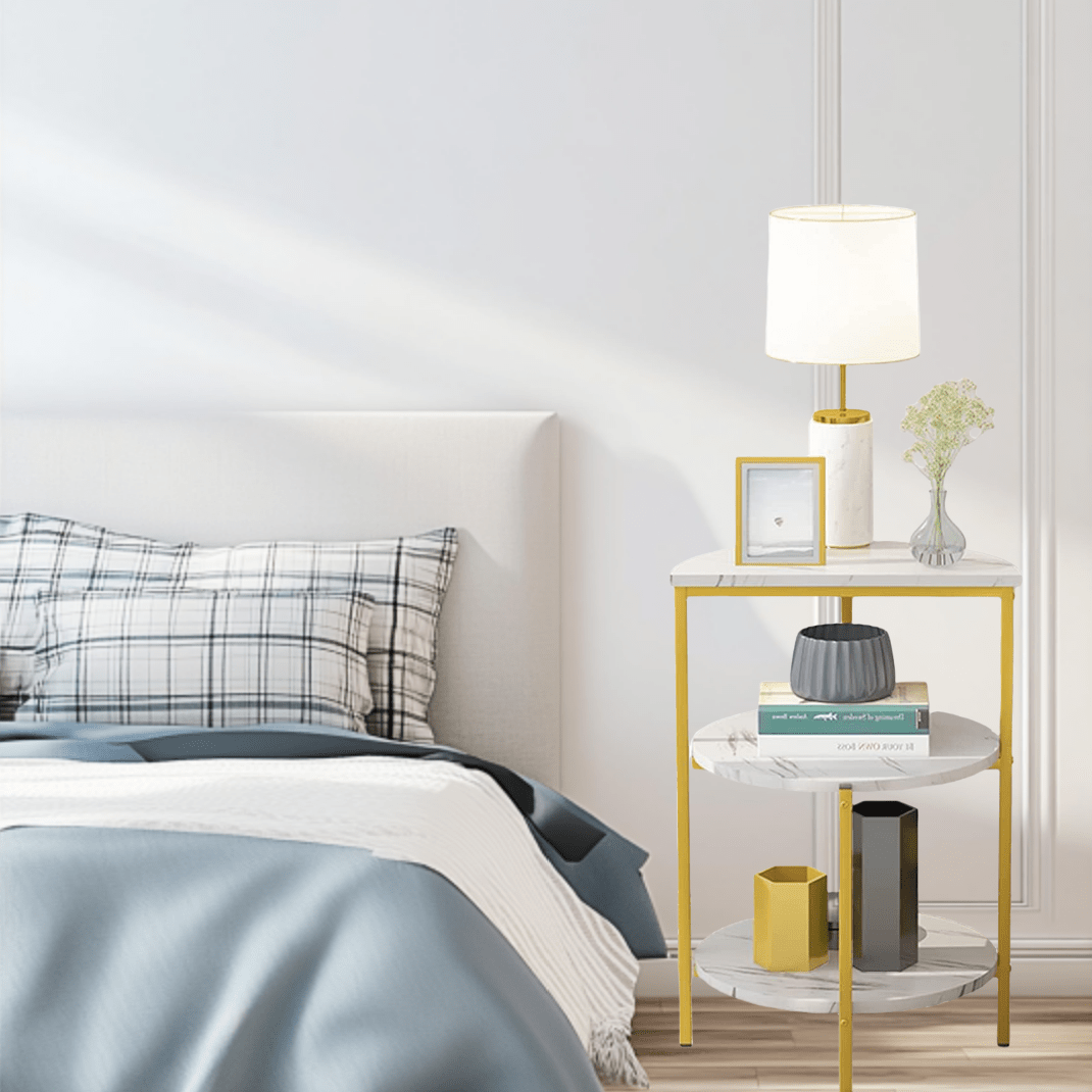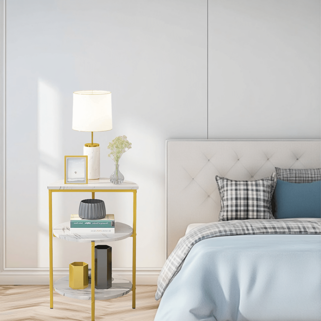 Modern End Table, 3-Tier Faux Marble Side Table for Living Room, Small Round Coffee Table with Gold Metal Frame, Bedside Tables Nightstand for Living Room, Bedroom,