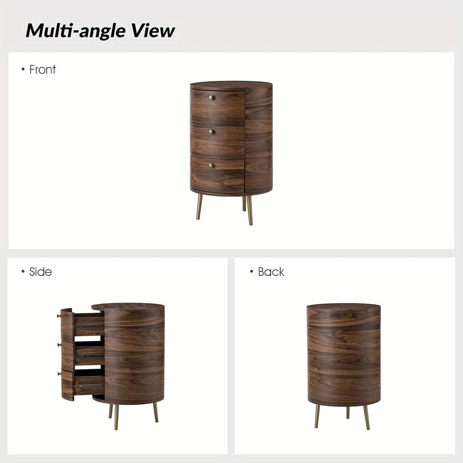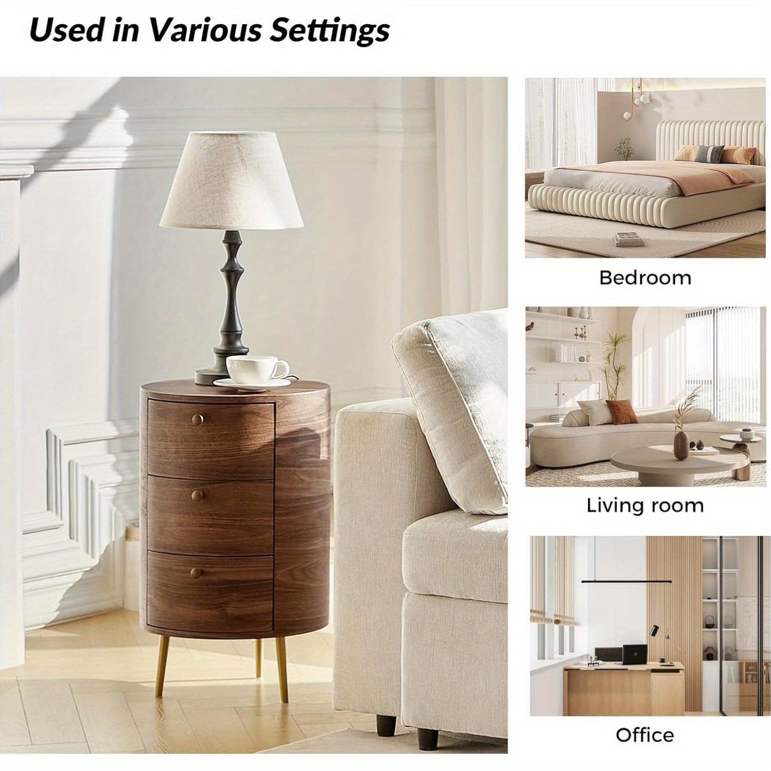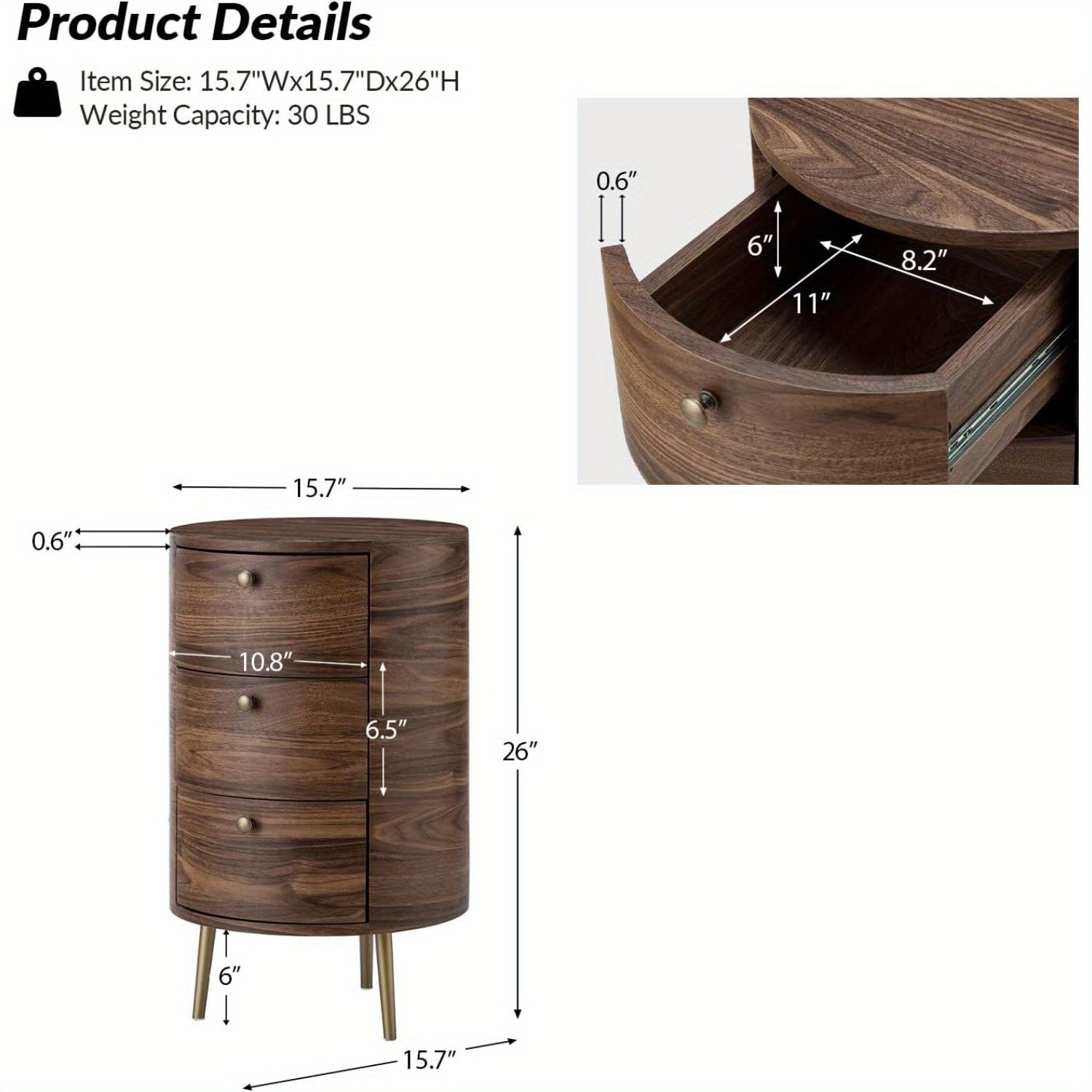 Round End Table with 3 Storage Drawers, Mid Century Modern Sofa Side Table with Metal Legs, Farmhouse Wood Small Side Table for Living Room,