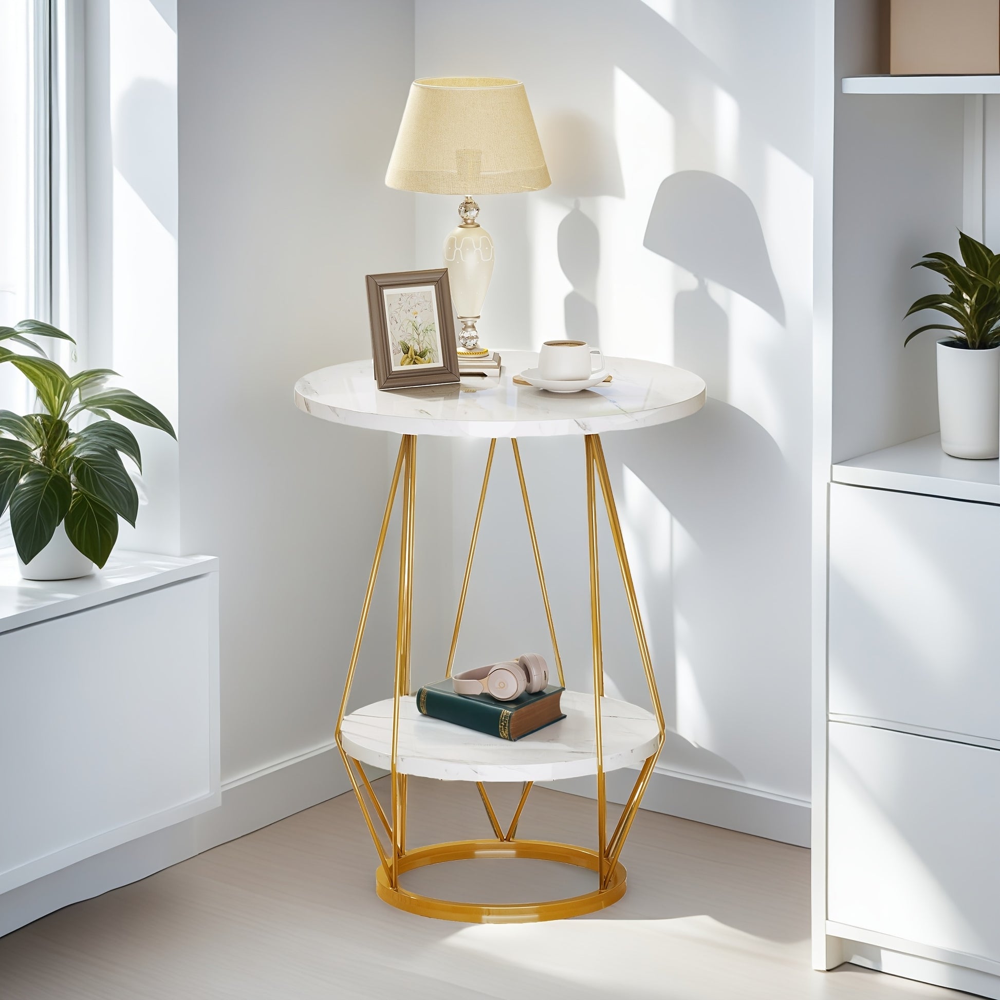Sablyme 2-Tier Faux Marble Side Table with Storage, Round End Table for Living Room, Bedroom & Office, White & Golden Finish